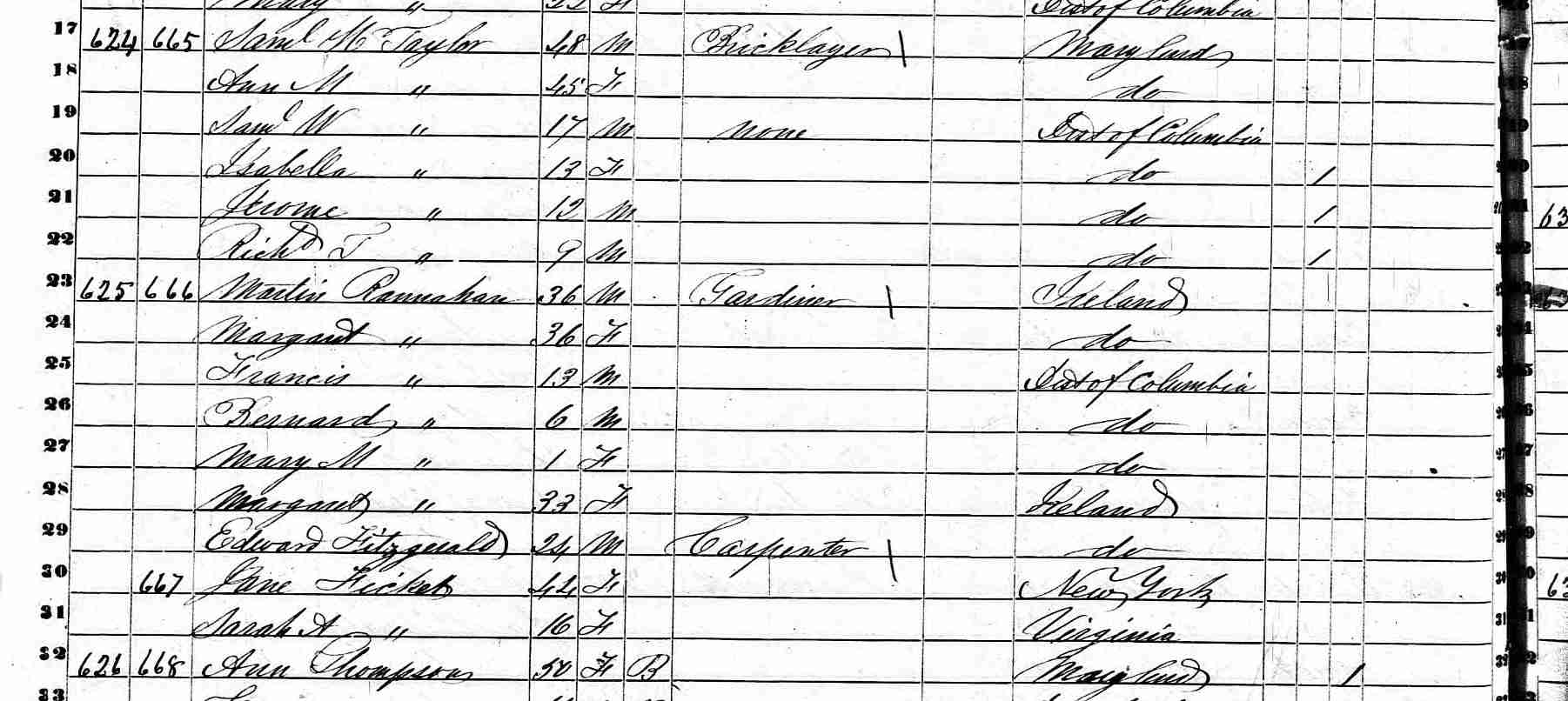 1850 District of Columbia; 1st Ward; Washington City. Household of Martin Ranahan