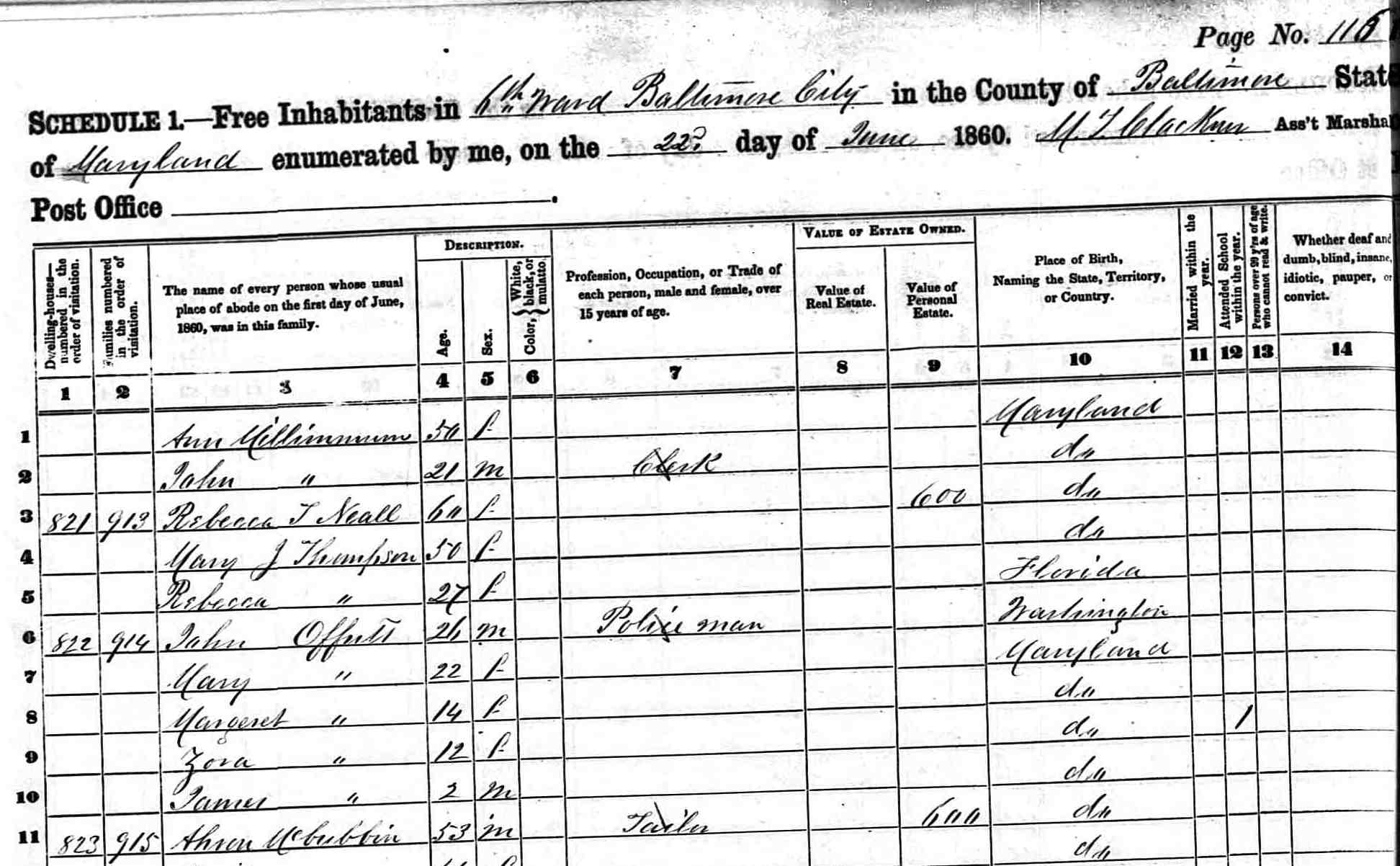 1860 Federal Census; 6th Ward, Baltimore City, Baltimore County, MD