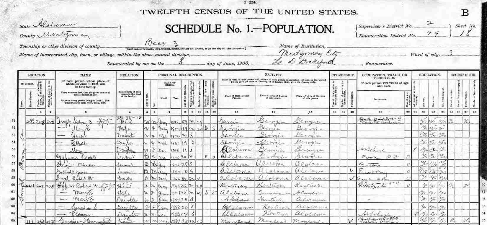 1900 Federal Census; Ward 3, Montgomery, Montgomery County, Alabama. Household of Robert W. Offutt