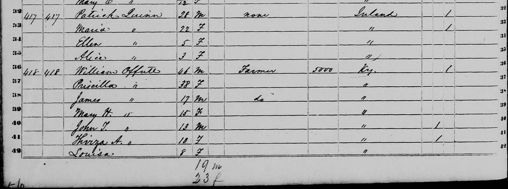1850 Federal Census for District #1 East Part, Scott County, KY. Household of William Offutt