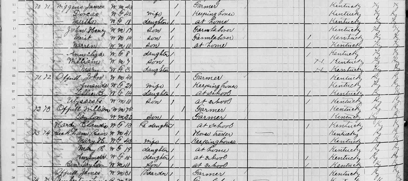 1880 Federal Census; Turkey Foot District, Scott County, KY. Household of William Offutt