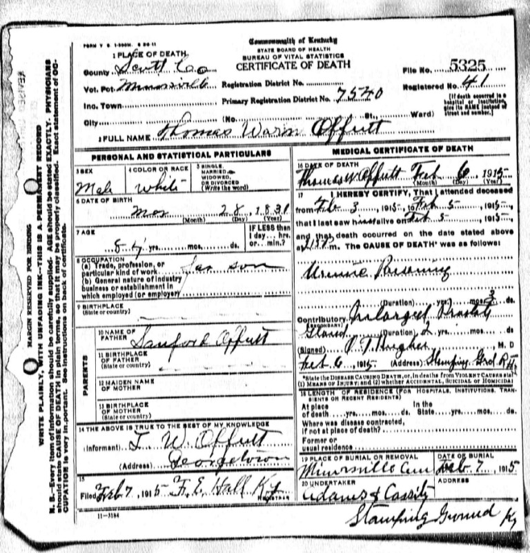 Kentucky Death Certificate # 5325 for Thomas Warn Offutt