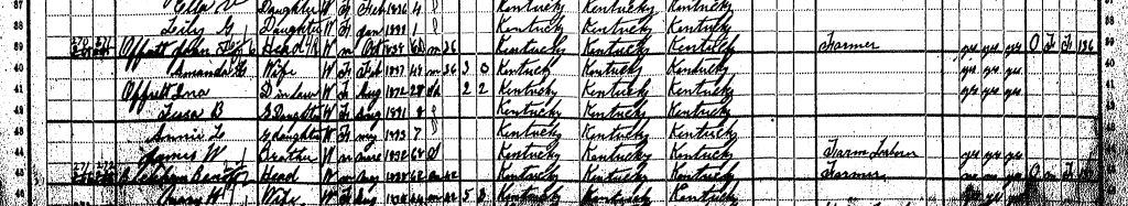 1900 Federal Census; Turkey Foot Voting Precinct, Scott County, KY. Household of John T. Offutt (Indexed as John F. Offutt)