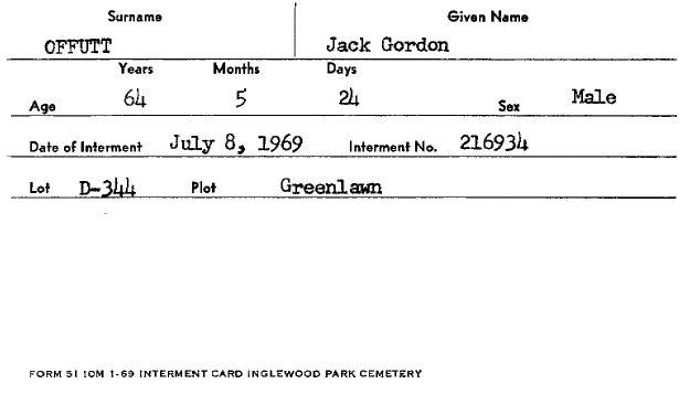 Internment card from Inglewood Park Cemetery for Jack Gordon Offutt