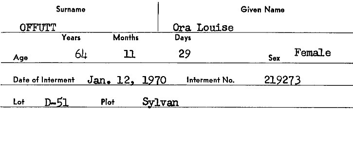 Internment card from Inglewood Park Cemetery for Ora Louise Offutt