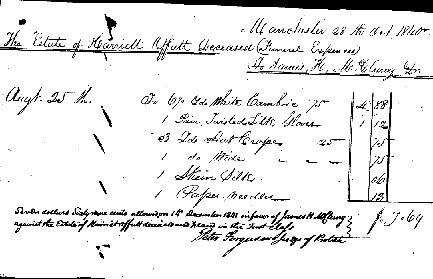 Funeral Expenses statement, presented to the court in the Estate of Harriet Offutt