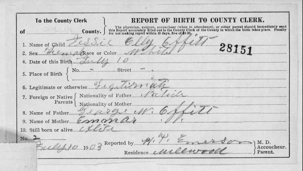 Birth Report for Jessie Elly Offitt born July 10, 1903