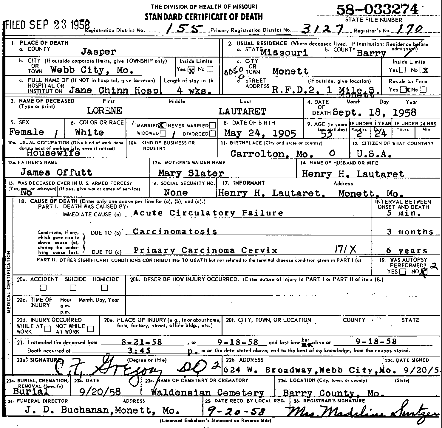 MO Death Certificate State File #58-033274 for Lorene Lautaret (nee Offutt)