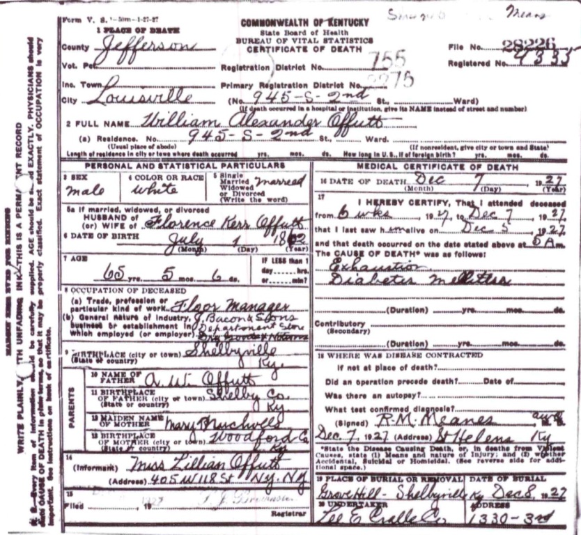Death Certificate for William Alexander Offutt