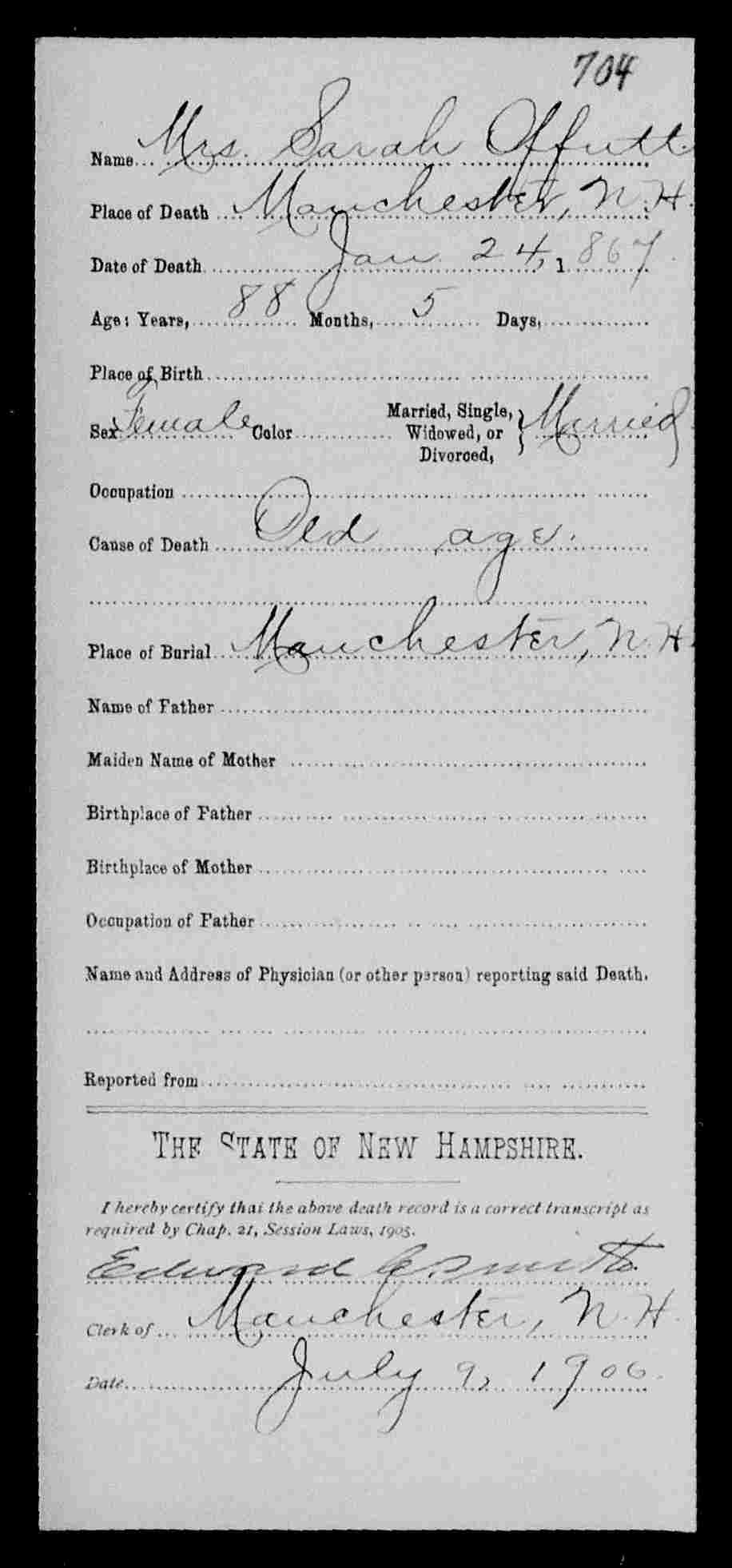 New Hampshire Death Record for Mrs. Sarah Offutt