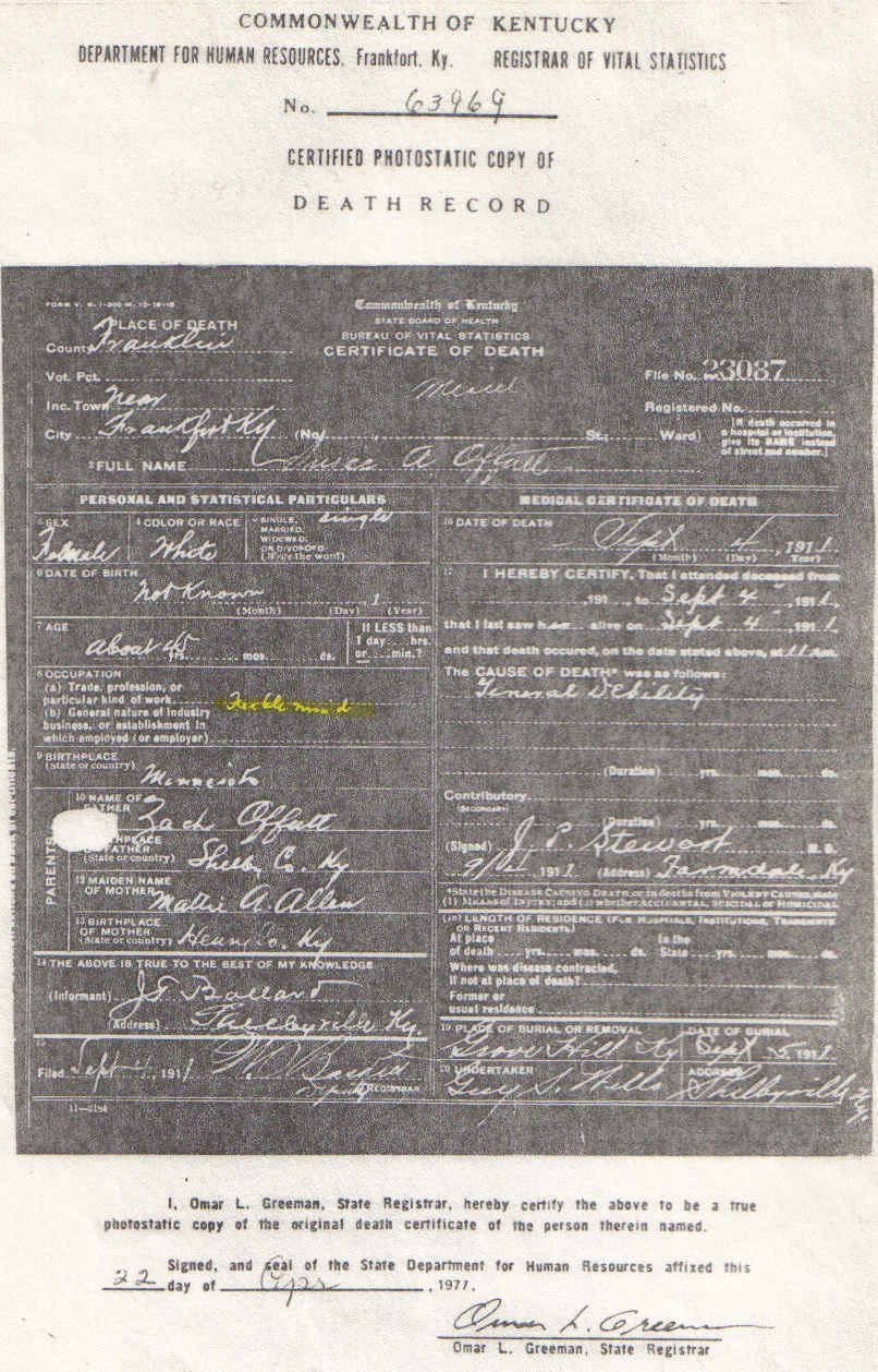 Photocopy of the Kentucky Death Certificate for Susie A. Offutt
