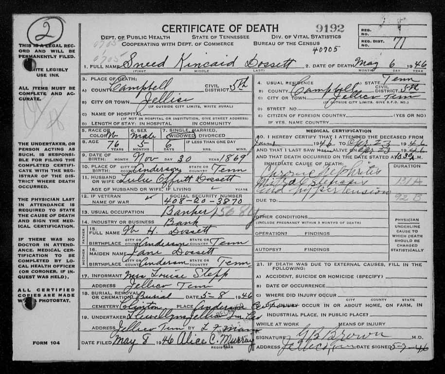 State of Tennessee; Certificate of Death for Sneed Kincaid Dossett