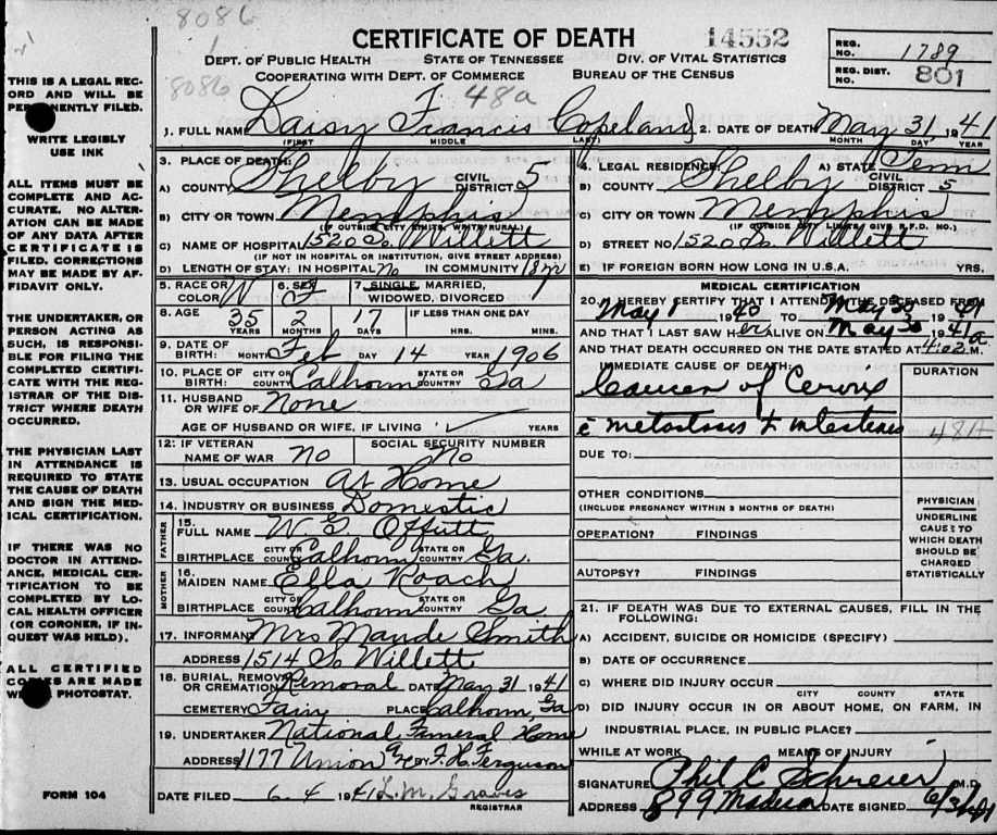 State of Tennessee; Certificate of Death for Daisy Francis Copeland