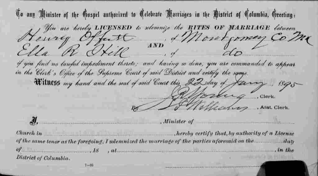 DC Marriage License for Henry L. Offutt to Ella R. Hill