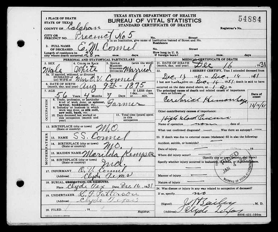 TX Death Certificate for E. M. Connel