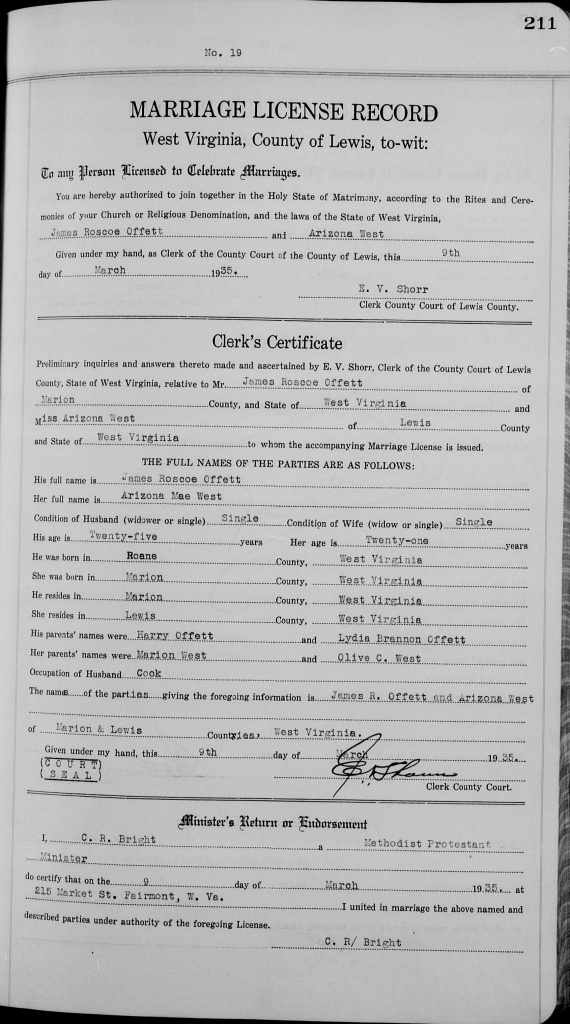 Marriage record for James Roscoe Offett to Arizona Mae West