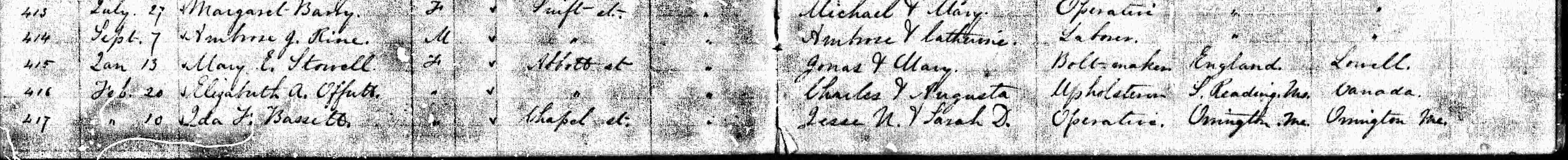 1863 Birth Register for Lowell MA, lists Elizabeth A. Offutt as #416