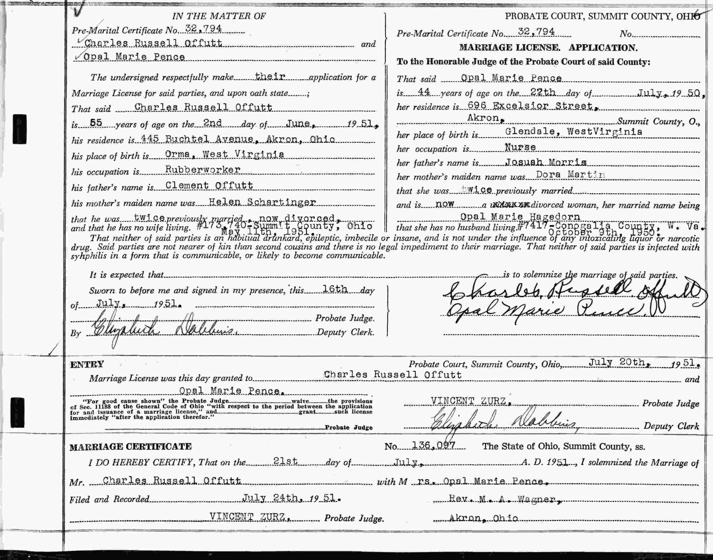 Marriage Record for Charles Russell Offutt and Opal Marie Pence