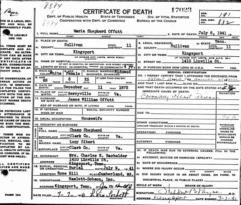 State of Tennessee; Certificate of Death for Maria Shepherd Offutt