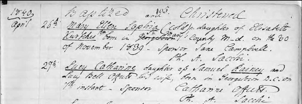 Holy Trinity Church Baptism Register Page 105, lists Lucy Catherine Rainey April 27, 1840