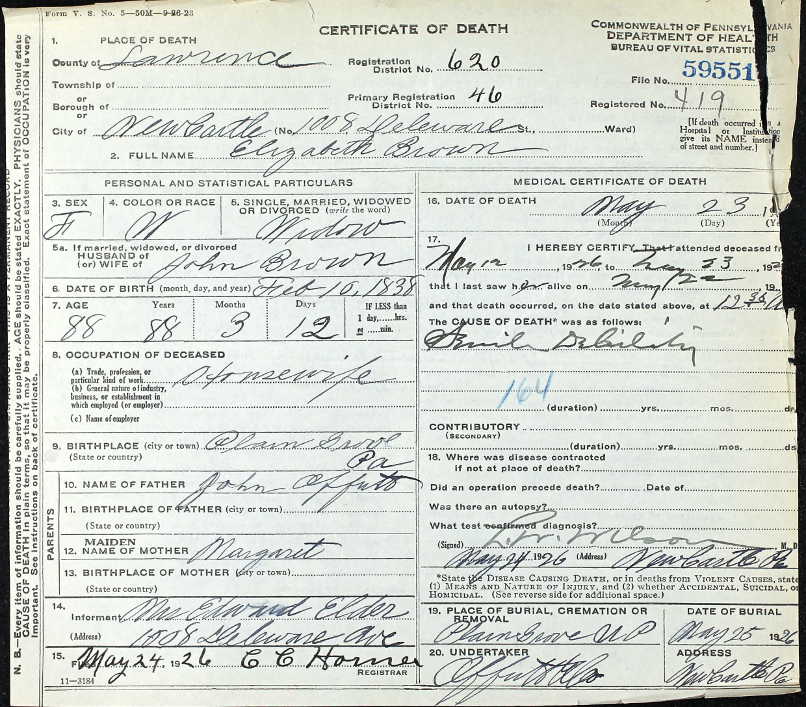 Pennsylvania Certificate of Death for Elizabeth Brown