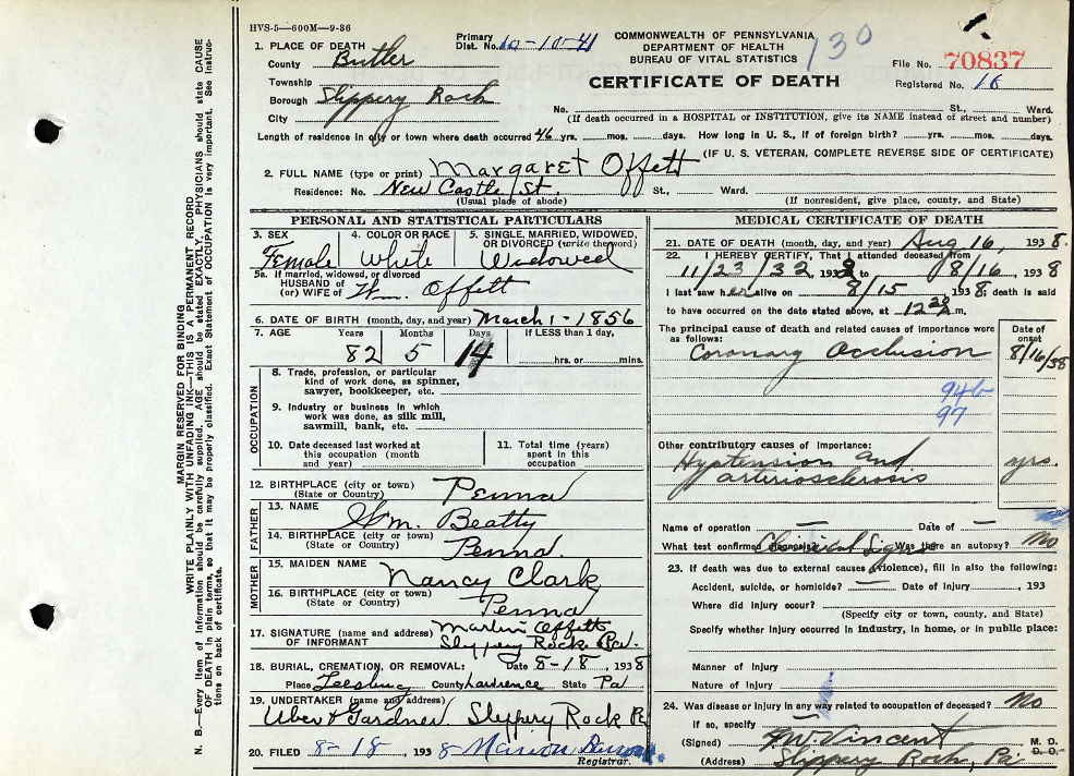 Pennsylvania Certificate of Death for Margaret Offett (Note incorrect spelling of last name