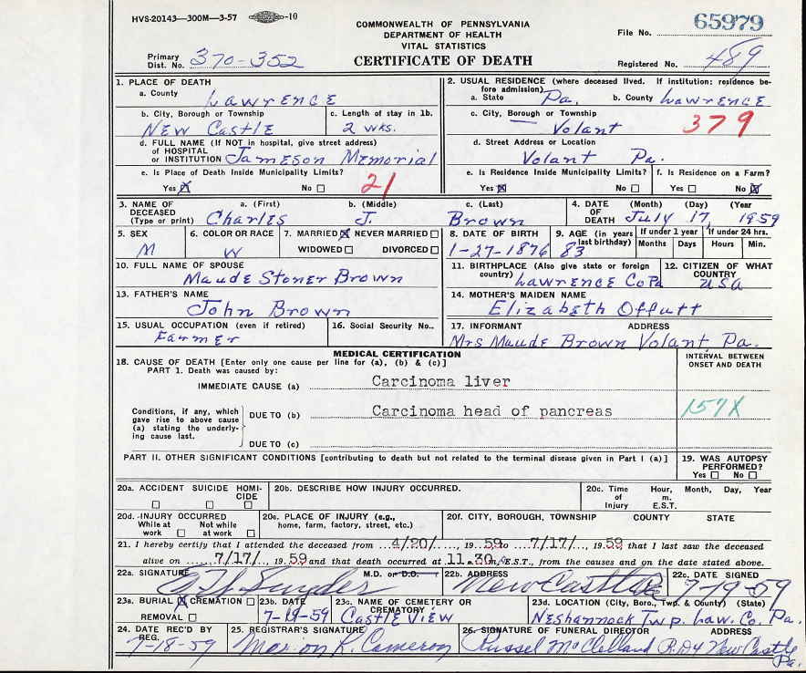 Pennsylvania Certificate of Death for Charles J. Brown