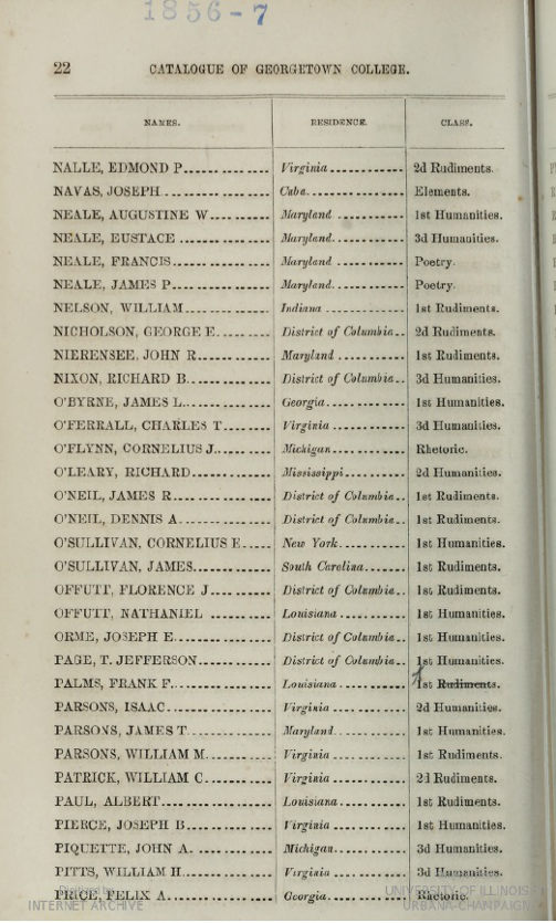 Catalogue of Officers and Students of Georgetown College, District of Columbia for the academic year 1856-1857, page 22.