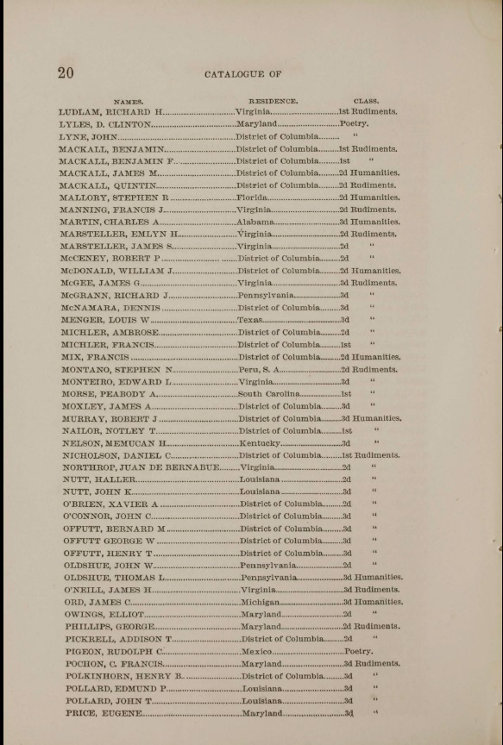 Catalogue of Officers and Students of Georgetown College, District of Columbia for the academic year 1865 - 1866 page 20.