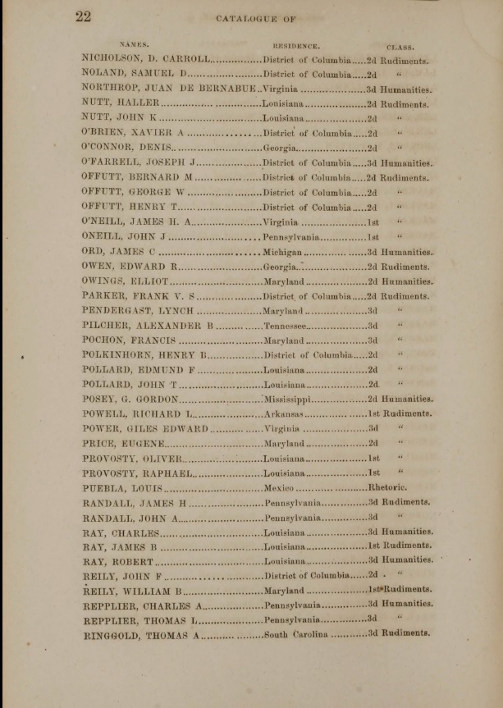Catalogue of Officers and Students of Georgetown College, District of Columbia for the academic year 1866 - 1867 page 22.