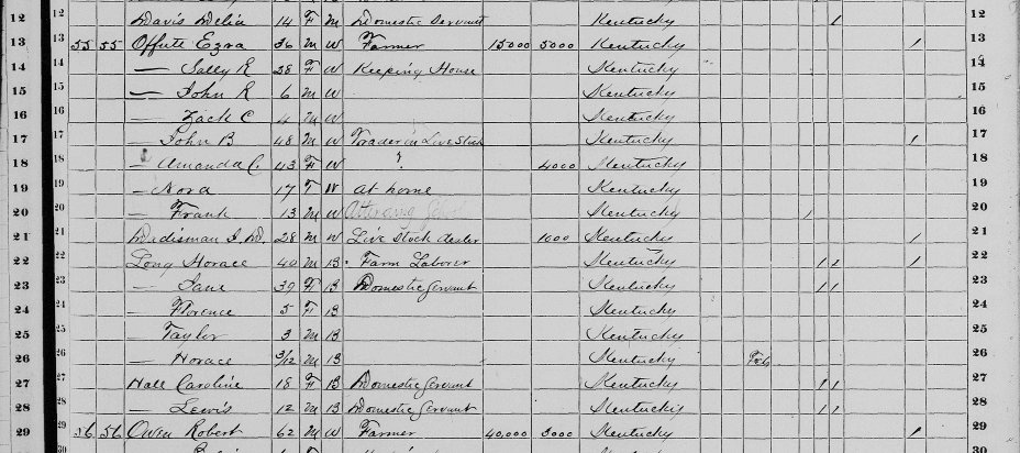 1870 Federal Census of 1st District, Shelby County, KY. Household of Ezra Offutt