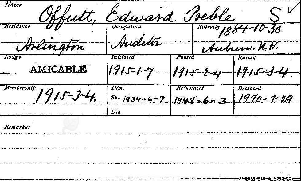 Massachusetts Grand Lodge of Masons Membership Card for Edward Preble Offutt