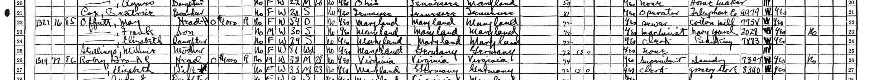 1930 Federal Census; Ward 13, Baltimore, Baltimore City, Maryland. Household of May Offutt