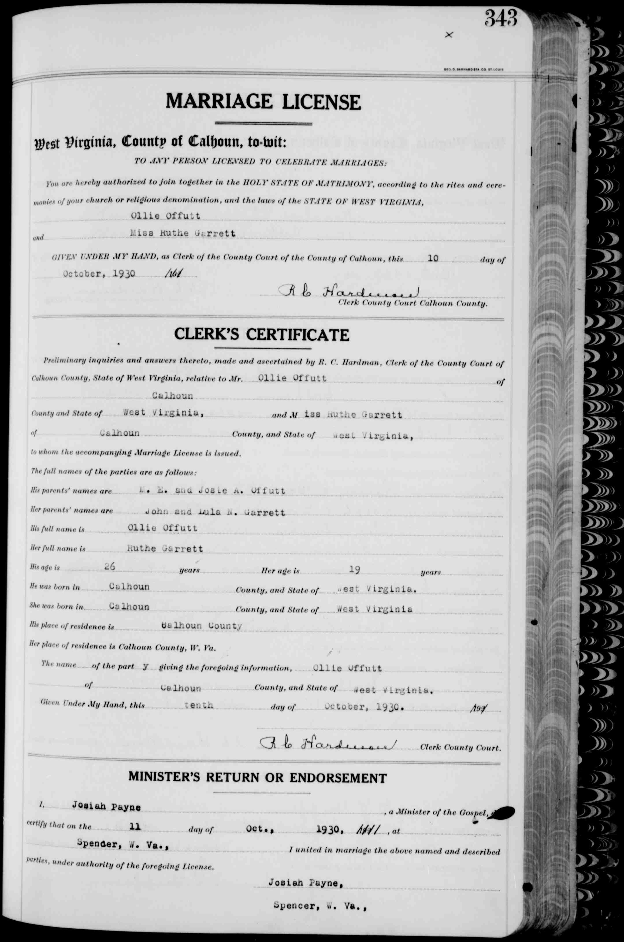 Marriage License for Ollie Offutt and Ruthe Garrett