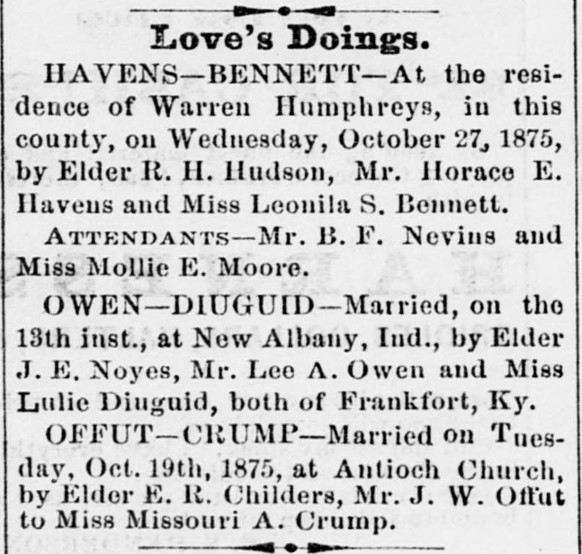 Printed in the Friday, October 29, 1875 edtion of the Fulton Telegraph, page 3. Wedding of J. W. Offut and Miss Missouri A. Crump