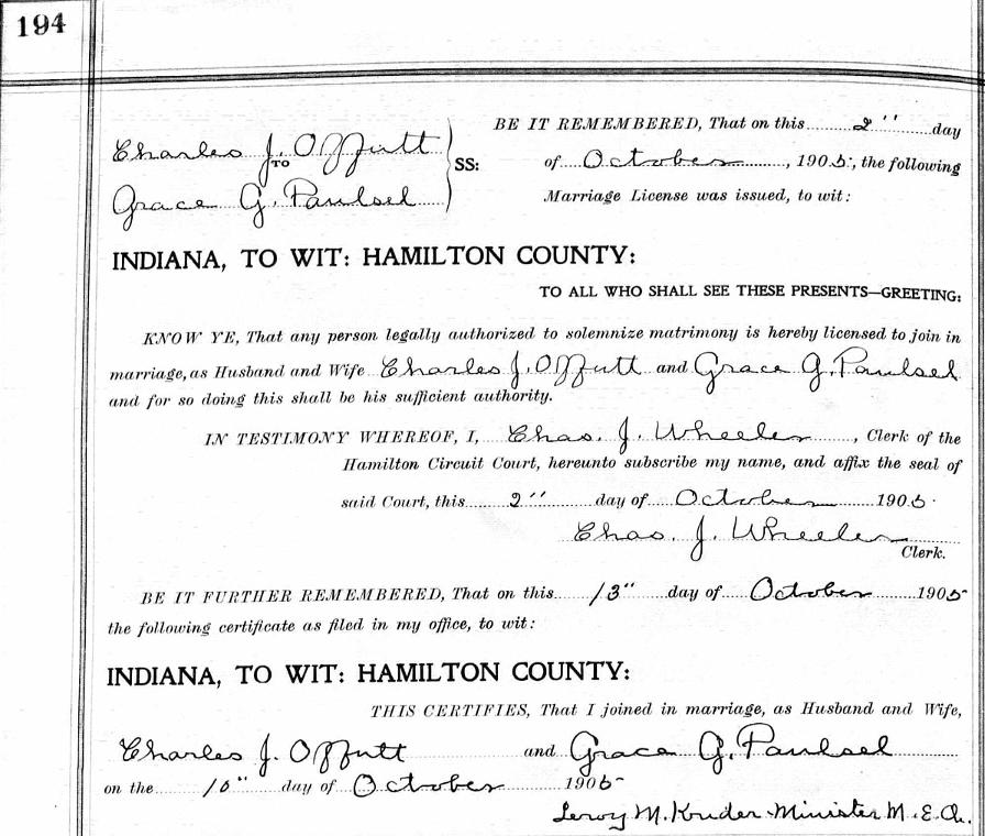 Hamilton County Marriages Volume 12, page 194; record for Charles J. Offutt to Grace G. Paulsel