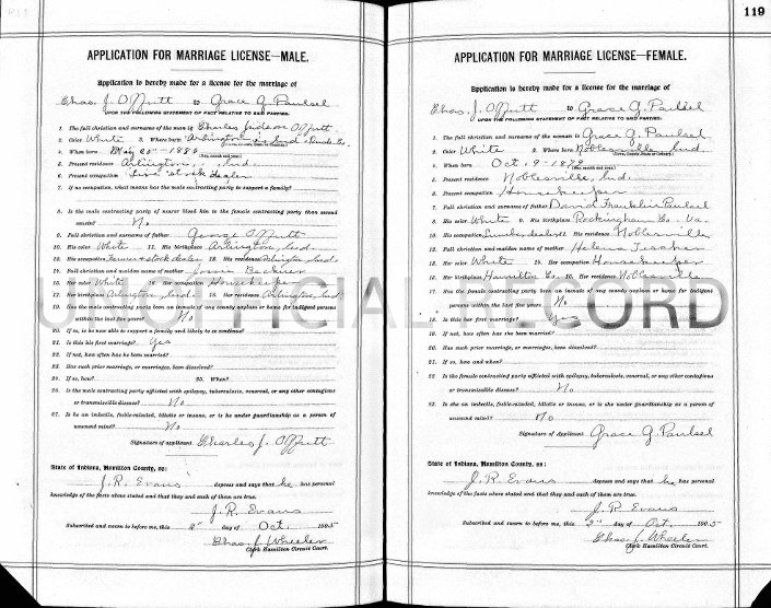 Hamilton County Marriages; License Applications for Groom and Bride; record for Charles J. Offutt to Grace G. Paulsel