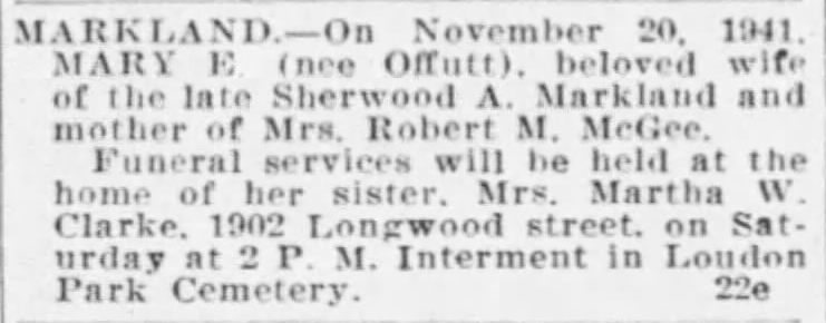 Death of Mary E. Markland