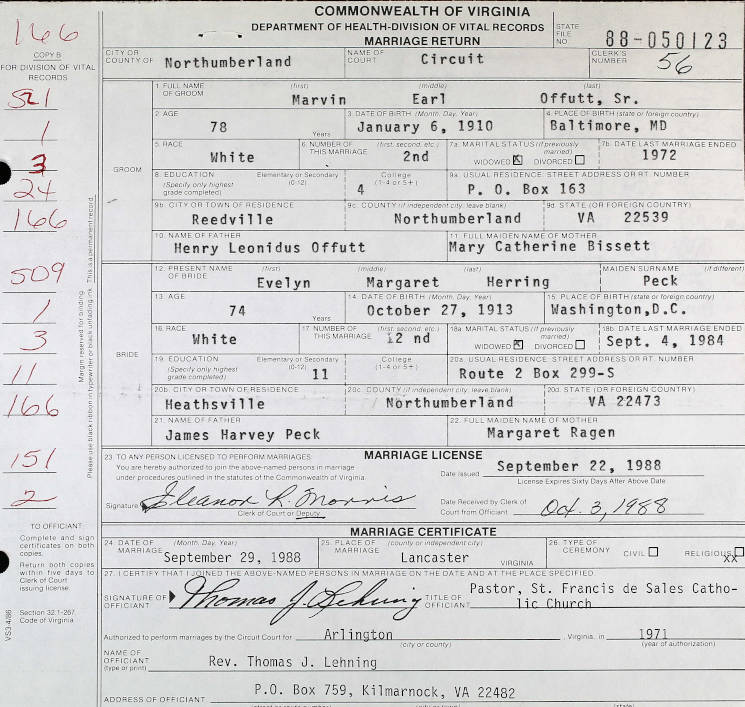Commonwealth of Virginia Marriage Return for Marvin Earl Offutt Sr. & Eveleyn Margaret Herring