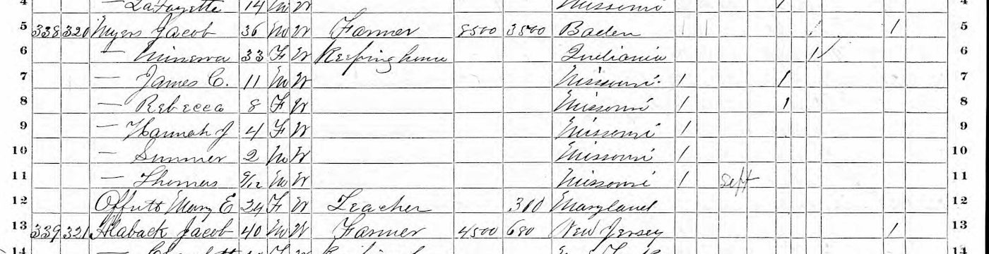 1870 Federal Census of Lewis Township, Holt County, Missouri. Household of Jacob Myers, lists Mary E. Offutt