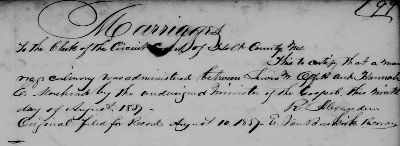 Book B Holt County Marriage Records page 99; Lewis W. Offitt to Hannah E. Morehead