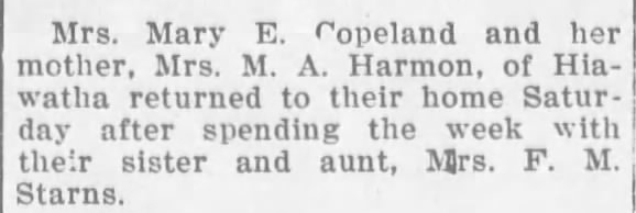Visit of Mrs. Mary E. Copeland and her mother Mrs. M. A. Harmon spend the week as they visit their sister and aunt Mrs. F. M. Starns