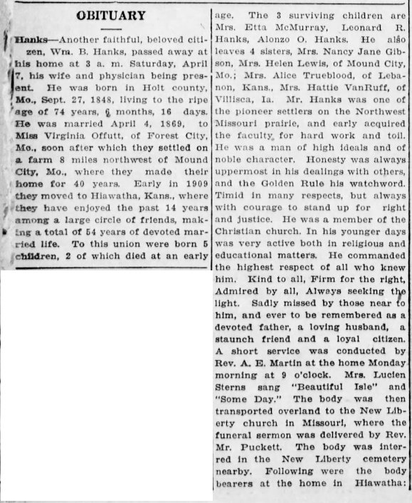 Printed in the Monday, April 9, 1923 edition of The Hiawatha Daily World on page 4