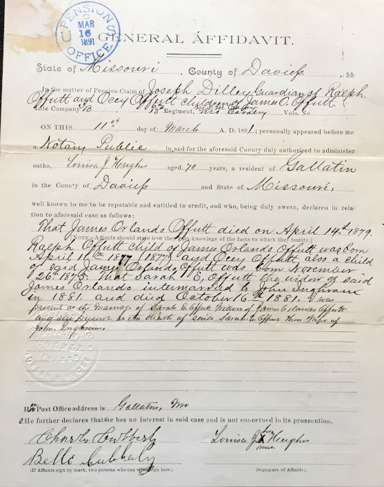 General Affidavit filed in support of pension for children of James Orlando Offutt and Sarah Jackson