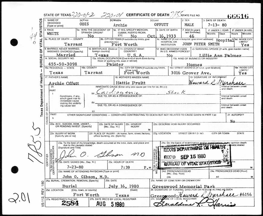 Texas Death Certificate for Odis Archie Offutt