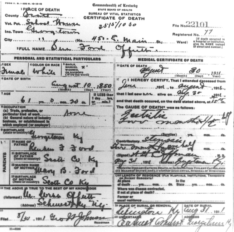 Sue Ford Offutt, Kentucky Death Certificate