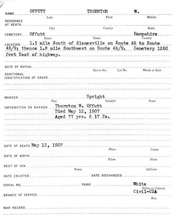 Works Progress Administration veteran burial survey card for Thornton W. Offutt