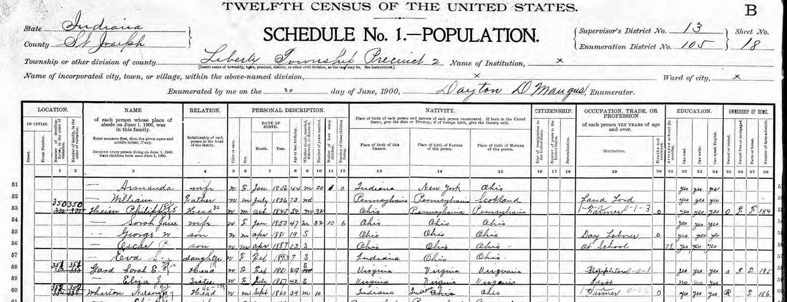 1900 Federal Census; Liberty Township, St. Joseph County, IN. Household of Sarah E. Gard