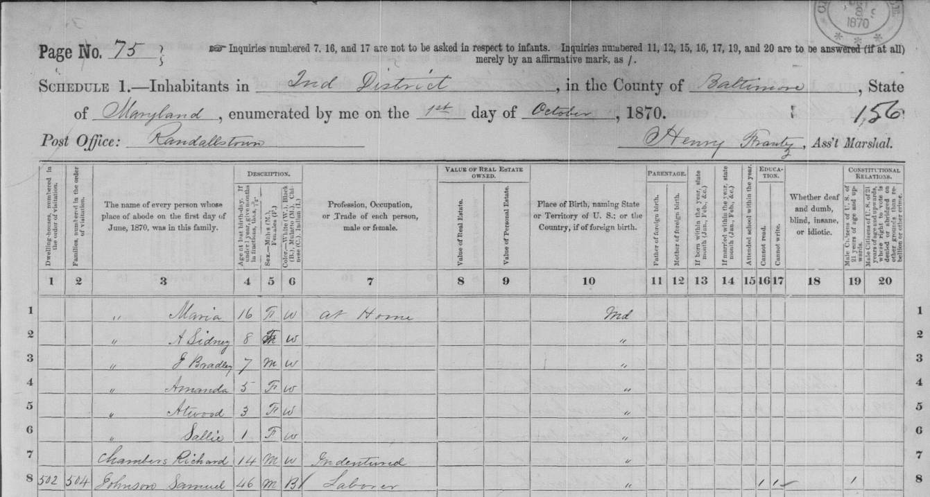 1870 Federal Census; 2nd District, Baltimore County, Maryland. Household of Atwood Blunt