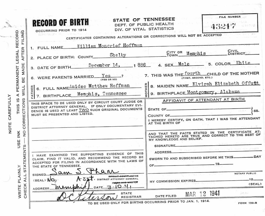 Tennessee Delayed Birth Certificate for William Moncrief Hoffman